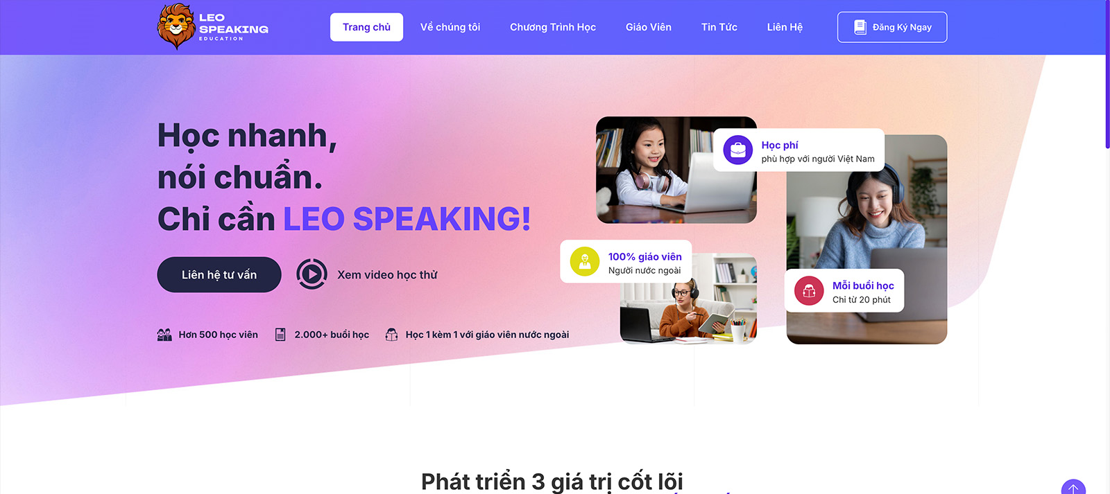 Website giới thiệu hoạt động dạy học giao tiếp tiếng anh và có chức năng tạo affiliate user kèm theo dữ liệu form đăng ký được đẩy về Sheet Google hệ thống thứ 3 của LEO